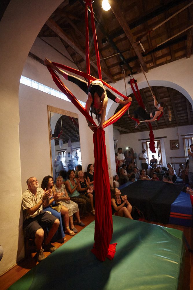 Seguimos el calendario escolar impartiendo clases desde octubre a junio en tres periodos trimestrales. El curso se cierra con una muestra de nuestro alumnado más jóven y los grupos más avanzados que culminan con un espectáculo que recorre todo el Corral, llevando al espectador a diferentes salas con números de tela, aro y trapecio.
